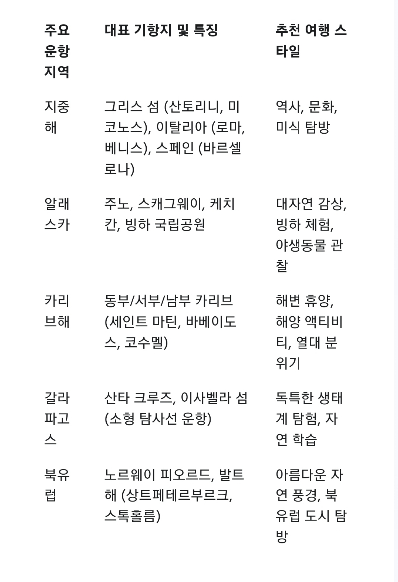 주요 운항 지역 대표 기항지 및 특징 추천 여행 스타일