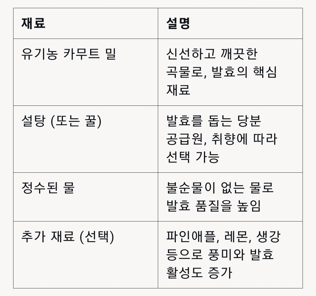 카무트 효소를 만들 때 가장 중요한 것은 신선한 유기농 카무트 밀입니다. 유기농 카무트를 선택하면 농약 걱정 없이 안심하고 발효할 수 있어요. 설탕은 발효를 촉진하는 역할을 하며, 백설탕이나 꿀, 갈색 설탕을 사용할 수 있습니다. 저는 꿀을 사용했을 때 부드러운 풍미가 더해져 좋았어요. 또한, 정수된 물은 발효 과정에서 불순물을 줄이는 데 필수적입니다. 발효를 더 풍부하게 만들고 싶다면 파인애플, 레몬, 생강 같은 과일이나 채소를 추가해도 좋아요.