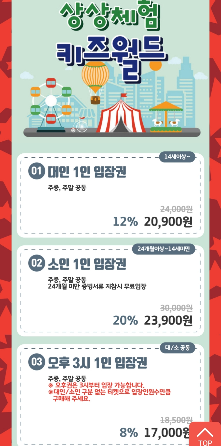 킨텍스 상상체험의 입장료는 아이들의 연령과 이용 시간에 따라 다양하게 책정되어 있습니다. 24개월 미만 영아는 무료입장이 가능하며, 24개월 이상 14세미만 어린이의 경우 평일 기준으로 종일권은 23,900원, 오후권은 17,000원입니다. 성인 동반자의 경우 20,900원의 입장료가 부과됩니다.