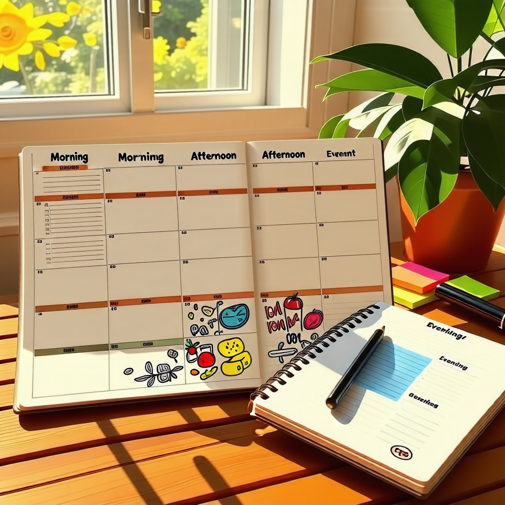 - **아침**: 평소와 같이 아침을 먹습니다. 건강한 식사를 통해 에너지를 충전합니다.